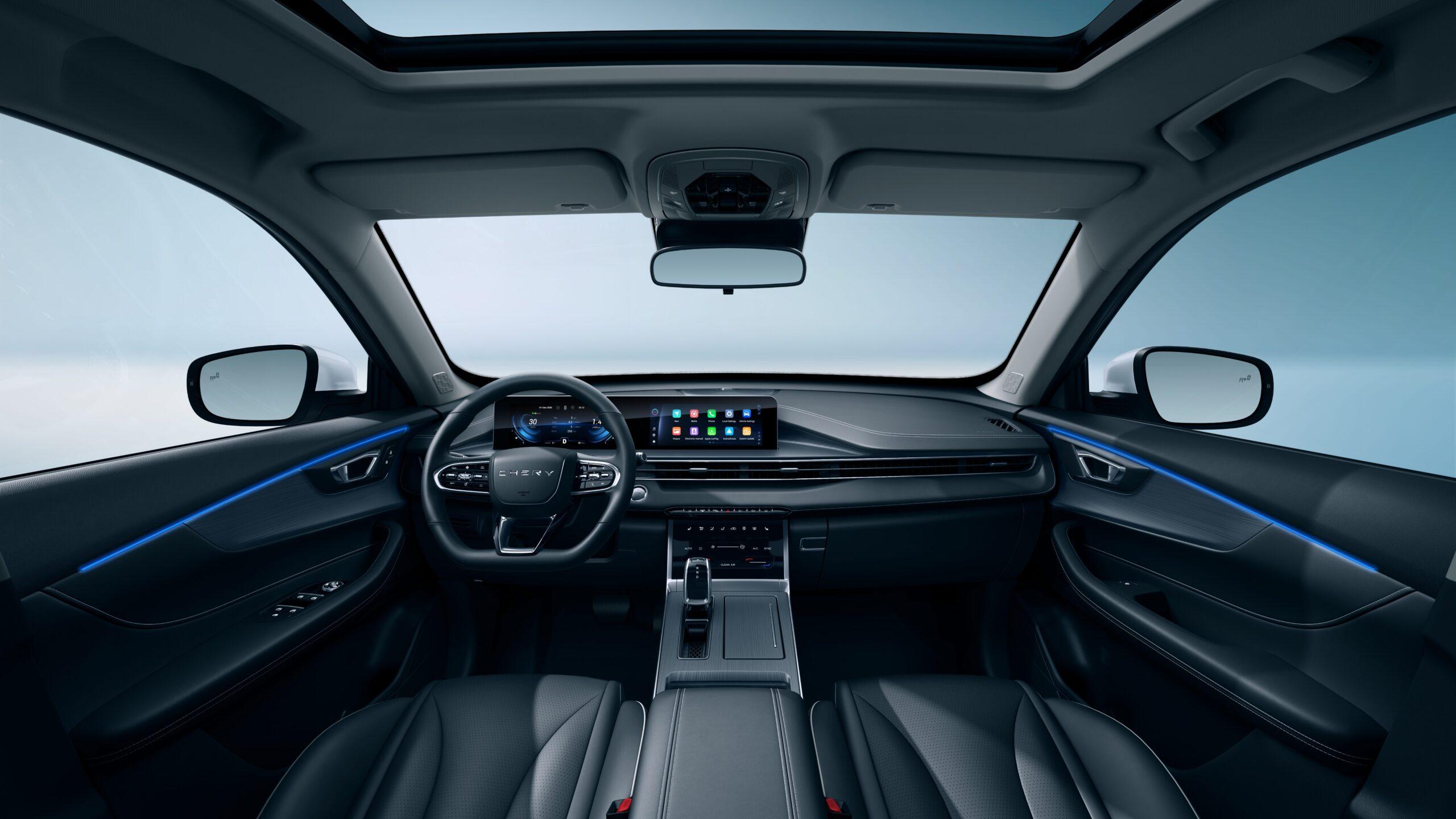 El TIGGO 4 Hybrid ofrece un interior moderno y cómodo con tapizado en cuero, volante multifunción tapizado en cuero ecológico y regulación eléctrica del asiento conductor. Además, cuenta con un techo solar panorámico eléctrico y una iluminación ambiental multicolor que aportan sofisticación y confort.
